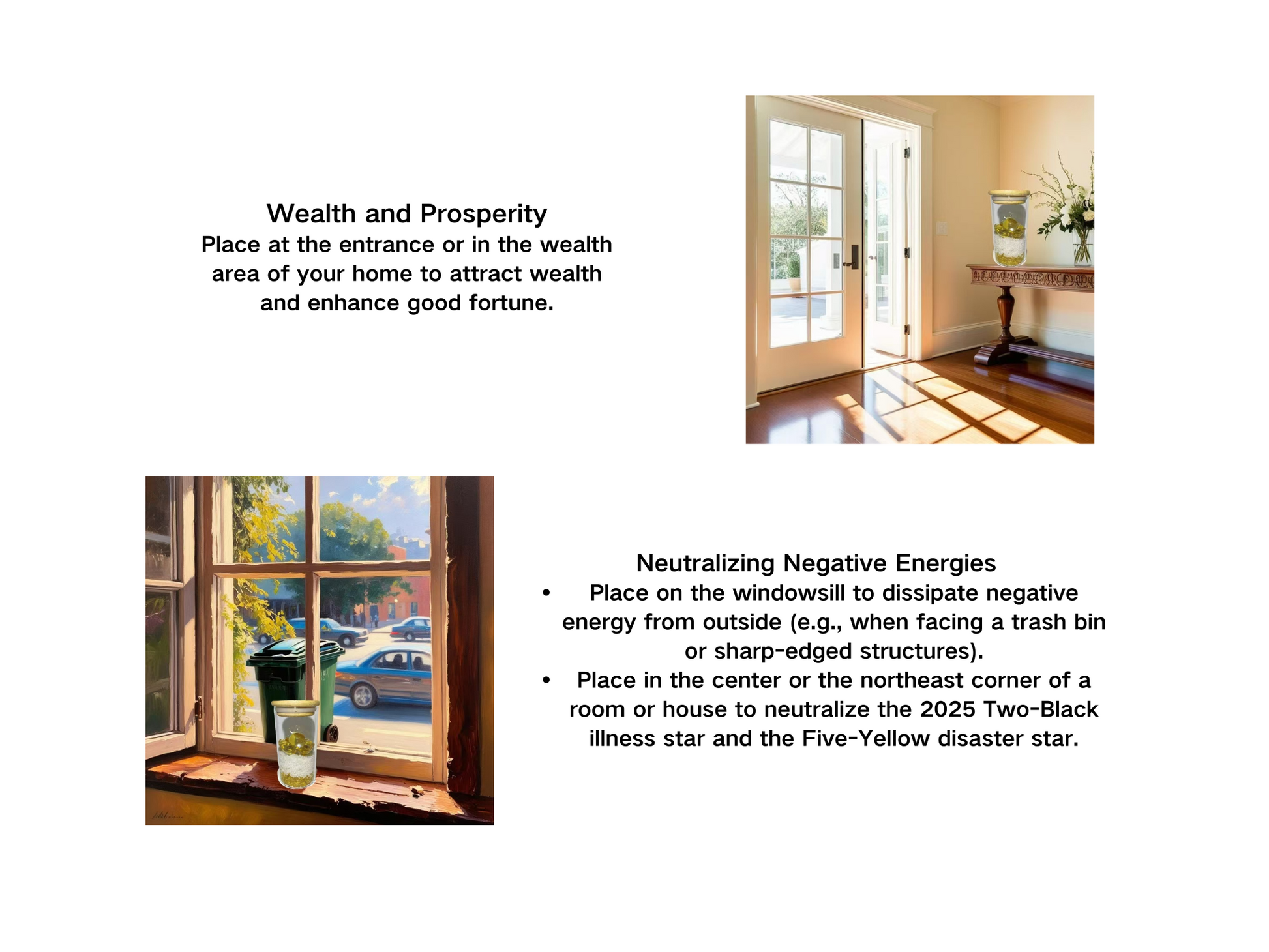 - Place in the center or the northeast corner of a room or house to neutralize the 2025 Two-Black illness star and the Five-Yellow disaster star.